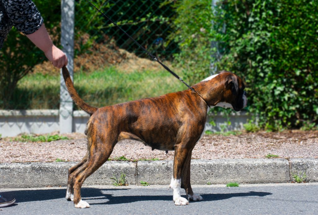 Jolie robe bringé/cuivré construite en lice. Puissante féminine, Bonne angulations, pied de chat, Poitrine haute et profonde. Dessus solide. Belle encolure, jolie tête et museau carré en harmonie avec un crâne ciselé. Bel ?il de couleur foncé. Excellente mâchoire et prognathisme normal. Jolis mouvements. Poitrail étroit.