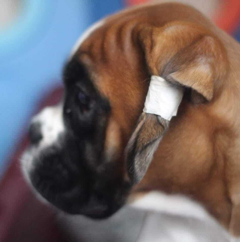 Il n’est pas rare que l’on croise des chiots boxer avec des « pansements » autour des oreilles.